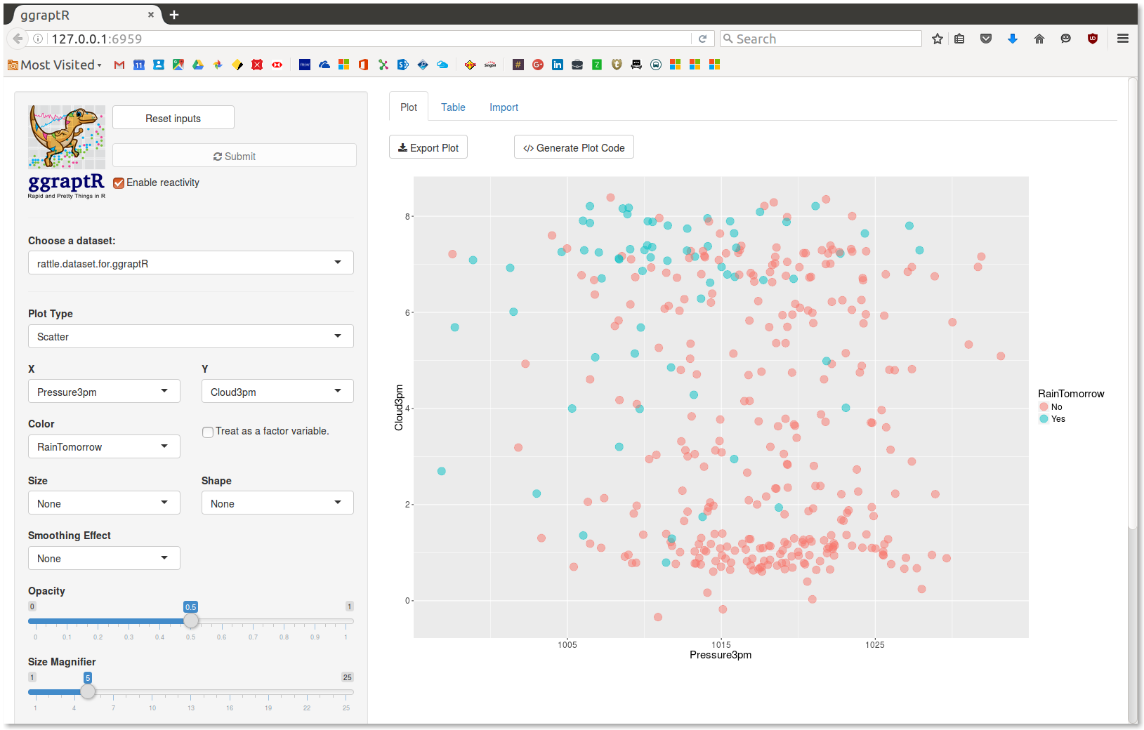 In line with Rattle’s philosophy of teaching programming of data by exposing all code through Rattle’s Log tab, ggraptR has a button to generate the plot. You can click the Generate Plot Code button, copy the resulting code and paste it into the R console, knitr document, or jupyter notebook. Execute the code and you generate the plot. Now you can start fine tuning it some more if you like.
