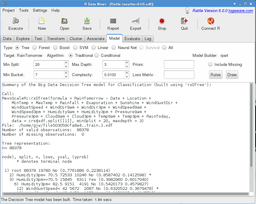The second major update is the initial support for Microsoft R Server so that Rattle can now handle datasets of any size. From Rattle’s Data tab choose an XDF file to load.