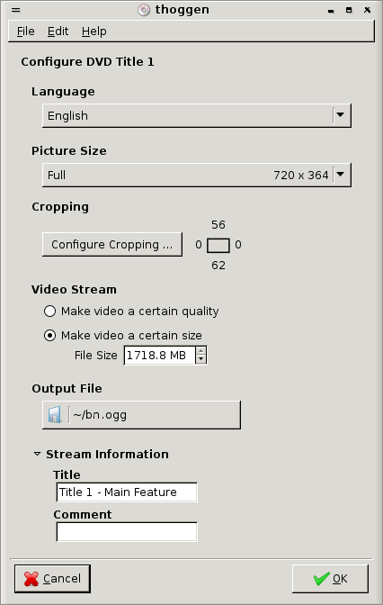 Figure ?? shows the initial screen, on the left, offering options for the choice of title to backup to disk from the DVD. On choosing the title, click the OK button to progress to the second screen, the configuration screen, as shown on the right in Figure ??.
