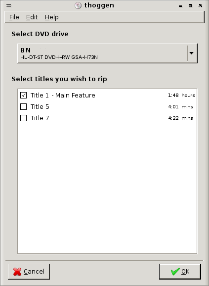 Thoggen offers a choice of titles to backup from a DVD. {#fig:thoggen-initial-bn}
